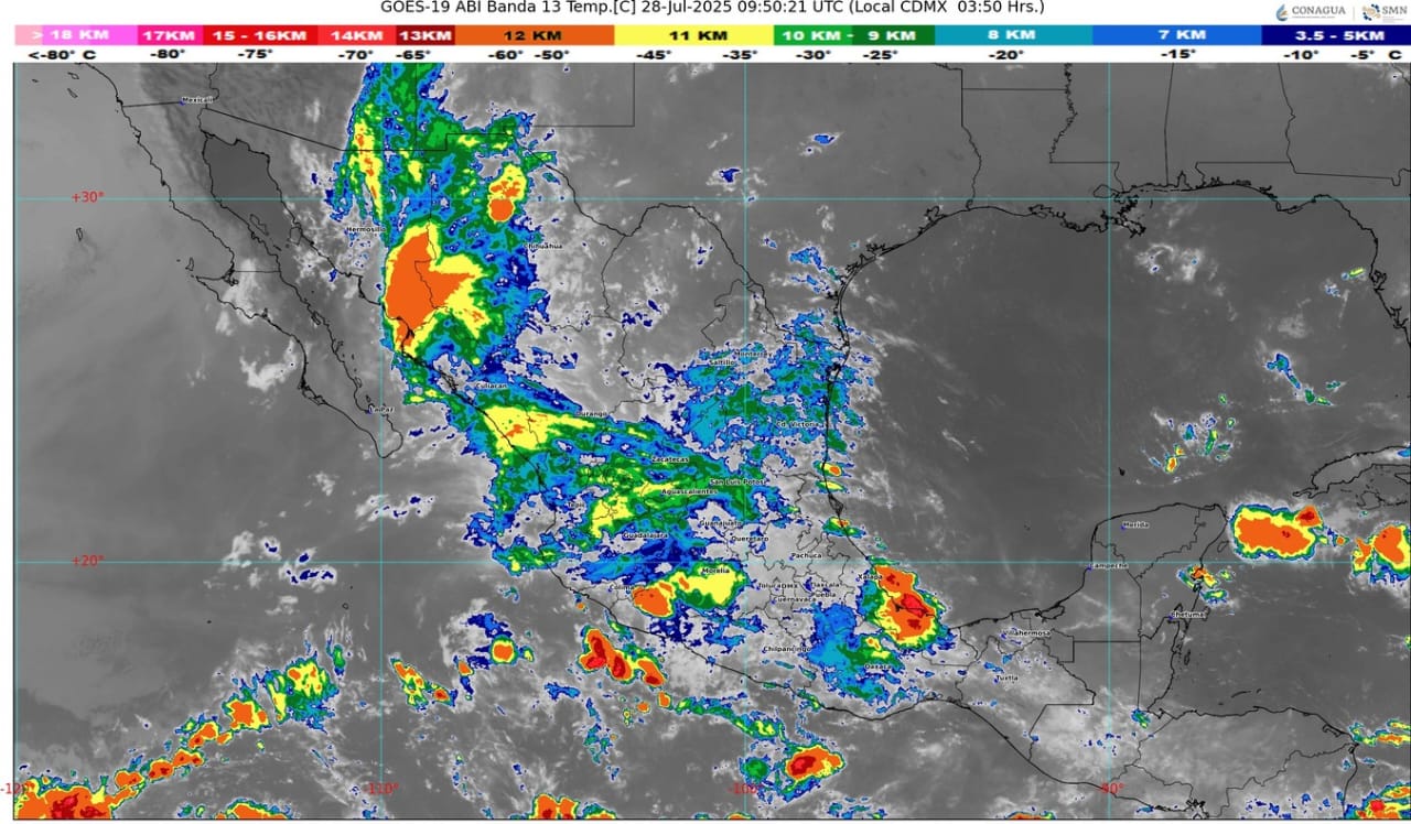 Por otro lado, un canal de baja presión sobre el norte y centro del país, en interacción con el ingreso de aire húmedo del golfo de México y con una vaguada en altura sobre el oeste del golfo de México, originarán lluvias puntuales muy fuertes en Puebla, Michoacán, Colima y Jalisco; puntuales fuertes en Guerrero y Estado de México; y lluvias con intervalos de chubascos en Tlaxcala, Morelos, Ciudad de México, Hidalgo, Querétaro; Guanajuato, Aguascalientes, Zacatecas, San Luis Potosí, Tamaulipas, Nuevo León y Coahuila.