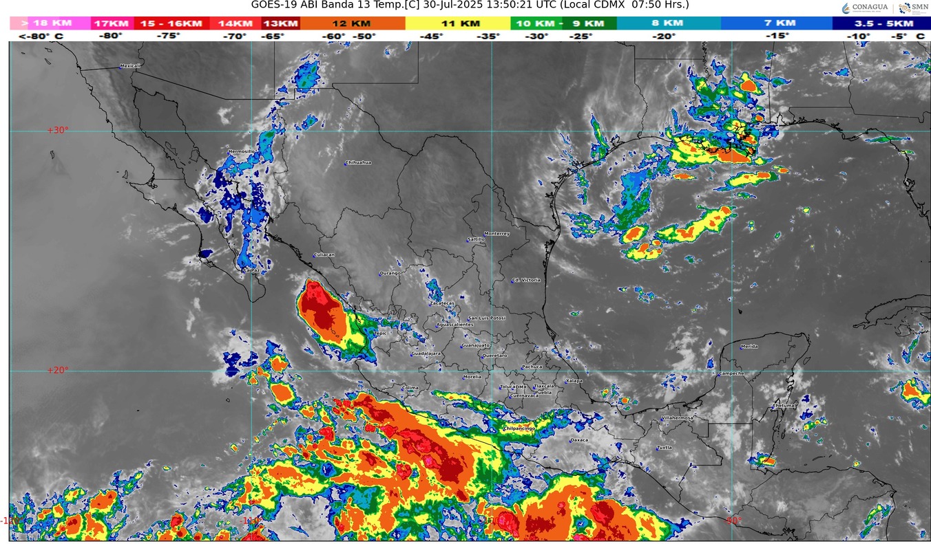 Sobre la Mesa del Norte y la Mesa Central, un canal de baja presión, una vaguada en altura y la entrada de aire húmedo desde el Pacífico ocasionarán lluvias intensas en Jalisco, y muy fuertes en Guerrero, Michoacán y Colima.