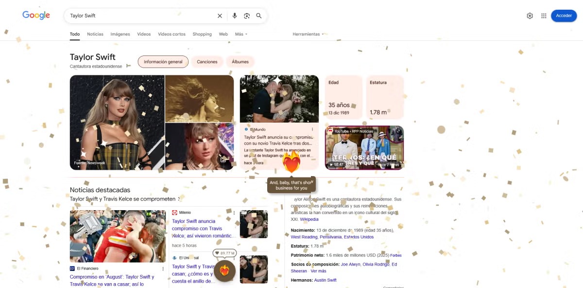 Como parte de la celebración digital, Google lanzó un efecto interactivo en su buscador. Al escribir el nombre de Taylor Swift, los usuarios no solo encuentran las últimas noticias relacionadas con la intérprete de Blank Space, sino que además la pantalla se ilumina con destellos y animaciones festivas.