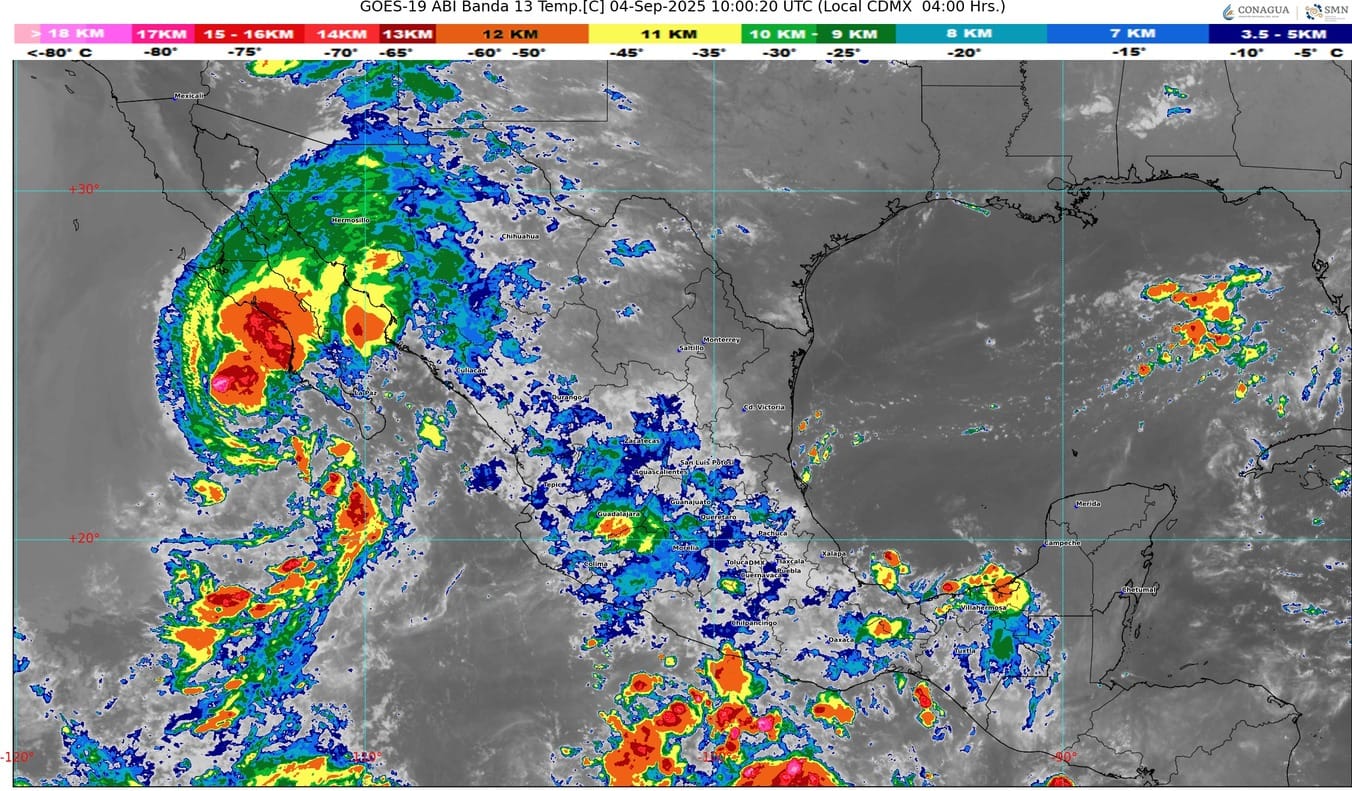 🔸Mantendrá lluvias torrenciales en BCS; intensas en Sinaloa, Sonora y sur de Baja California; muy fuertes en Nayarit y Durango; y puntuales fuertes en Chihuahua; así como intensas rachas de viento y oleaje elevado.